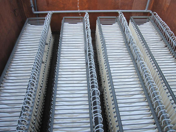 當(dāng)有足夠數(shù)量的有機(jī)營養(yǎng)物、礦物鹽和溶解氧時(shí),微生物在填料的表面繁殖,逐步形成畫膜。由于擴(kuò)散作用,氧和營養(yǎng)物質(zhì)通過膜供微生物吸收利用。當(dāng)膜長到一定厚度就會妨礙這種擴(kuò)散,水中的氧和營養(yǎng)物質(zhì)不能通到內(nèi)層,生物膜開始分層,表層是好氧層。面內(nèi)層由于缺氧形成厭氧層。新形成的厭氧層內(nèi),好氧菌死亡溶解,成為兼性厭氧菌和厭氧菌的營養(yǎng)。當(dāng)內(nèi)層膜營養(yǎng)耗盡,厭氧微生物也大量死亡溶解,于是生物膜內(nèi)層不能支撐表面的生物群體,大塊的生物膜脫落。生物膜脫落而造成的更新面又會形成新的生物膜。另外少量的生物和一些小塊生物膜,由于水的沖刷或氣泡振動,不斷離開生物膜進(jìn)人水中,這就是膜的脫落和更新。膜的脫落和更新對生物膜的活性有積極的作用,可以使生物膜保持穩(wěn)定的生物活性。脫落的膜沉淀后被排出系統(tǒng)。脫落和更新對水質(zhì)也有一定的影響,增加了水的濁度。