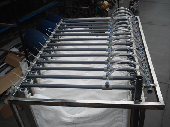 大量氣泡以較高速度穿過膜組件以及氣體夾帶的水流對膜表面的沖刷作用,使膜表面處于劇烈紊動狀態(tài),避免了凝膠層的增厚和堵塞物質的積累,可延長膜清洗周期。同時這種紊動作用還從兩方面減緩了濃差極化現象,一是通過曝氣提高水流速度,使其處于紊流狀態(tài),讓膜表面的高濃度與主流濃度更好地混合;二是對膜表面不斷進行清洗,消除已形成的凝膠層。