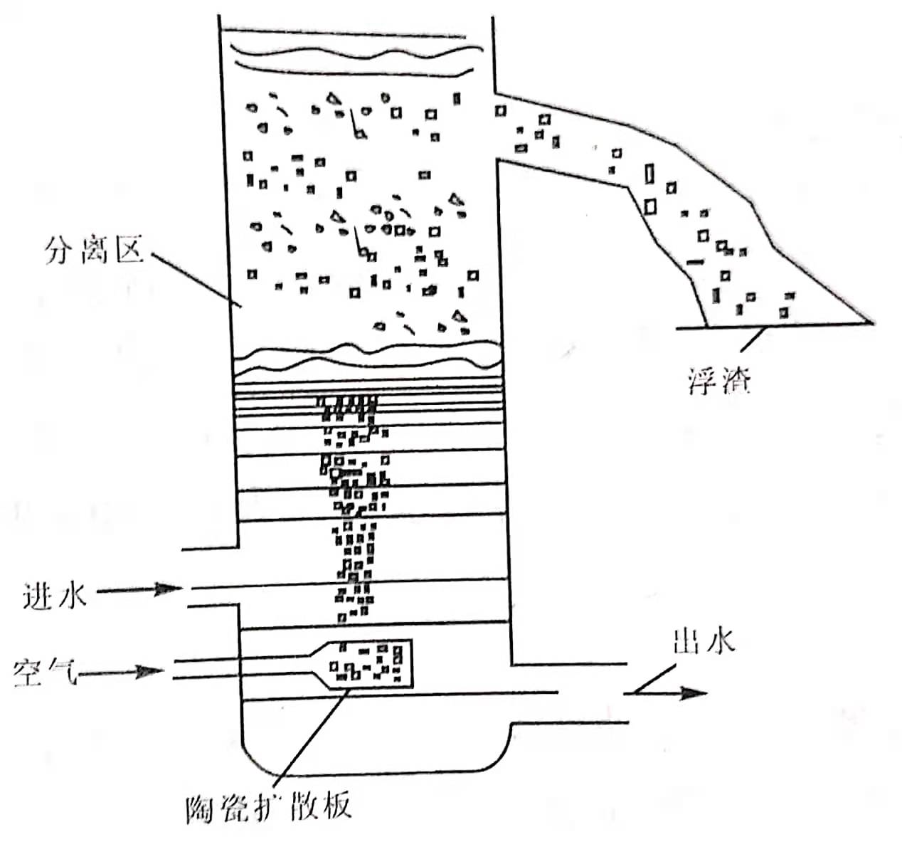 曝氣氣浮一般采用鼓風(fēng)機(jī)將空氣直接送至氣浮池充氣器,形成細(xì)小氣泡進(jìn)入污水中。充氣器一般用擴(kuò)散板、穿孔板或微孔管等,曝氣壓力在1kg/cm2,空氣量2-3m3/m3水。擴(kuò)散裝置的微孔不宜過(guò)小,否則易于堵塞;而微孔板孔徑過(guò)大,必須投加表面活性劑,方可形成可利用的微小氣泡,從而導(dǎo)致該種方法使用受到限制。近年研制、開(kāi)發(fā)的彈性膜微孔曝氣器克服了擴(kuò)散裝置微孔易堵或孔徑大等缺點(diǎn)。擴(kuò)散板曝氣氣浮示意圖見(jiàn)下圖。