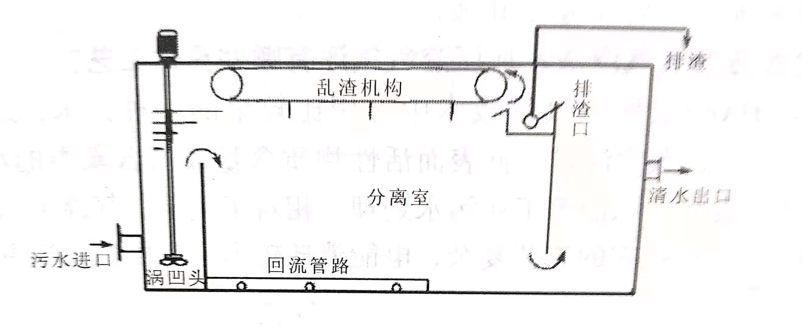 渦凹?xì)飧》Q為旋切氣浮,渦凹?xì)飧C(jī)是一種主要用于去除工業(yè)或城市污水中的油脂、膠狀物及固體懸浮物而設(shè)計(jì)的污水處理設(shè)備。系統(tǒng)主要由曝氣裝置、刮渣裝置和排渣裝置組成,其中曝氣裝置主要是渦凹曝氣機(jī),刮渣裝置主要由刮渣機(jī)和牽引鏈條組成,排渣裝置主要為螺旋推進(jìn)器,如下圖所示。工作時(shí),溶氣設(shè)備由電機(jī)帶動(dòng)高速旋轉(zhuǎn)(旋轉(zhuǎn)速度一般控制在1000~3000r/min),利用底部擴(kuò)散葉輪(該葉輪的葉片為空心狀)的高速轉(zhuǎn)動(dòng)在水中形成一個(gè)負(fù)壓區(qū),使液面上的空氣沿著“渦凹頭”的中空管進(jìn)入擴(kuò)散葉輪釋放到水中,并經(jīng)過(guò)葉片的高速剪切而變成小氣泡,小氣泡在上浮的過(guò)程中黏附在絮凝體上,而形成新的低密度絮凝體,靠水的浮力將水中的懸浮物帶到水面,然后靠刮渣裝置除去浮渣。開(kāi)放式的回流管道從曝氣段沿氣浮槽的底部伸展,渦凹曝氣機(jī)在產(chǎn)生微氣泡的同時(shí),也會(huì)在有回流管的池底形成一個(gè)負(fù)壓區(qū),這種負(fù)壓作用會(huì)使污水從池底回流至曝氣段,然后返回氣浮段。這個(gè)過(guò)程確保了30%-50%左右的污水回流,即整套系統(tǒng)在沒(méi)有進(jìn)水的情況下仍可工作。