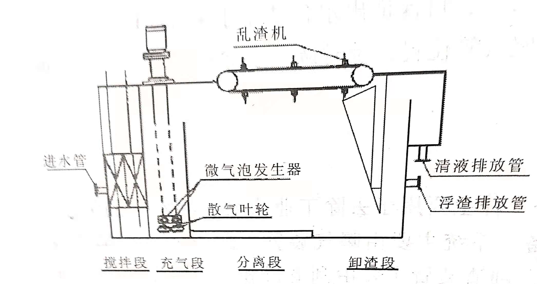 旋切式氣浮屬于引氣擴(kuò)散氣浮,它與溶氣氣浮、噴射引氣氣浮、多級(jí)擴(kuò)散氣浮及電解氣浮機(jī)理相同,因而同樣具有廣泛的應(yīng)用前景。其最大的優(yōu)點(diǎn)是形成的氣泡直徑與溶氣氣泡直徑相近,但其能耗卻小得多,而且不需要空壓機(jī)、溶氣罐、減壓釋放器等設(shè)施,占地面積小,基建投資也不大。旋切式氣浮機(jī)如下圖所示。