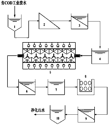 工業(yè)廢水通過廢水管線進(jìn)入集水井,集水井的出口通過廢水管線連接粗格柵,粗格柵的出口通過廢水管線連接一次沉淀池,一次沉淀池的出口通過廢水管線連接pH值調(diào)節(jié)池,pH值調(diào)節(jié)池的出口通過廢水管線連接納米微孔超聲波間歇聚合反應(yīng)槽,納米微孔超聲波間歇聚合反應(yīng)槽的出口通過廢水管線連接二次沉淀池,二次沉淀池的出口通過廢水管線連接曝氣硝化池,曝氣硝化池的出口通過廢水管線連接生物脫氮池,生物脫氮池的出口通過廢水管線連接三次沉淀池,三次沉淀池的出口通過廢水管線連接凈水池,凈水池的出口通過廢水管線將經(jīng)過本系統(tǒng)處理后的凈化出水外排;其中,納米微孔超聲波間歇聚合反應(yīng)槽的槽體采用高強(qiáng)度玻璃鋼材質(zhì),其頂板和底板上各并排裝有8支超聲波發(fā)生器,槽體中部設(shè)有上、下兩道不銹鋼網(wǎng)狀龍骨,分別用于固定上、下兩組納米微孔表面聚合體,兩組納米微孔表面聚合體中央安裝了6支攪拌槳葉,槽體左側(cè)設(shè)有進(jìn)水閥門,右側(cè)設(shè)有出水閥門;經(jīng)過酸化的工業(yè)廢水通過納米微孔超聲波間歇聚合反應(yīng)槽左側(cè)的進(jìn)水閥門進(jìn)入反應(yīng)槽內(nèi)部,16支超聲波發(fā)生器開始工作,發(fā)出超聲波,廢水中的有機(jī)物在超聲波協(xié)同化學(xué)效應(yīng)的作用下,在納米微孔表面聚合體的表面發(fā)生C-H鍵的短暫斷裂,由于納米微孔表面聚合體材料中添加有能夠催化聚合反應(yīng)進(jìn)行的氯化烯丙基鈀二聚物,在其催化聚合作用下,已經(jīng)斷裂的C-H鍵會迅速在納米微孔表面聚合體的納米孔隙處發(fā)生C-H鍵的再結(jié)合,從而在納米微孔表面聚合體的表面發(fā)生聚合反應(yīng),超聲波發(fā)生器開啟一定時間后即停止工作,同時兩組納米微孔表面聚合體中央的6支攪拌槳葉同時開始攪拌以產(chǎn)生液體湍流作用,這會使剛剛形成的有機(jī)物聚合體的分子量不斷增大,逐步匯聚成大顆粒的不溶物質(zhì)并從納米微孔表面聚合體表面脫落,以懸浮物的形式分散于廢水中,并隨廢水通過反應(yīng)槽右側(cè)的出水閥門排出反應(yīng)槽,進(jìn)入二次沉淀池,并最終通過沉淀過程從廢水中加以除去,同時,納米微孔超聲波間歇聚合反應(yīng)槽中的攪拌槳葉停止工作,超聲波發(fā)生器重新開啟,并通過進(jìn)水閥門重新注入廢水,開始新一輪催化聚合反應(yīng)過程,如此往復(fù)循環(huán);其中,pH值調(diào)節(jié)池的作用是將經(jīng)過一次沉淀的廢水pH值調(diào)節(jié)至1.5~3.0,以滿足納米微孔超聲波間歇聚合反應(yīng)槽的入水pH值要求;其中,曝氣硝化池的作用是通過好氧曝氣過程,使廢水中的各種含氮物質(zhì)均轉(zhuǎn)化為硝酸鹽氮;其中,生物脫氮池的作用是通過生物活性反應(yīng)過程,將廢水中的硝酸鹽氮分解轉(zhuǎn)化,從而去除硝酸鹽氮。