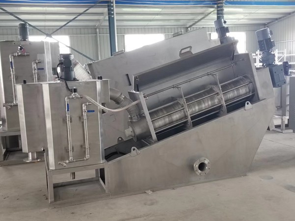 設(shè)備前端為濃縮段,后端為脫水段。污泥在濃縮段經(jīng)重力脫水后,被運(yùn)輸?shù)矫撍?,在前進(jìn)過程中隨著慮縫及螺距的逐漸變小,以及背壓板的作用下,產(chǎn)生極大的內(nèi)壓,容積不斷縮小,達(dá)到充分脫水的目的,