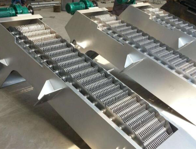 該機(jī)有柵齒、柵齒軸、鏈板等組成柵網(wǎng),以替代傳統(tǒng)格柵的柵條。柵網(wǎng)在機(jī)架內(nèi)作回轉(zhuǎn)運(yùn)動(dòng),從而將污水中的懸浮物攔截并不斷分離水中的懸浮物,因而工作效率高、運(yùn)行平穩(wěn)、格柵前后水位差小,并且不易堵塞。該機(jī)適合于作粗細(xì)格柵使用。柵網(wǎng)中的柵齒可用工程塑料或不銹鋼兩種材料制造,柵齒軸和鏈板等由不銹鋼制造,大大提高了格柵整體的耐腐蝕性能。較小間隙的格柵一般宜用不銹鋼柵齒。設(shè)備運(yùn)行使耙齒把截留在柵面上的雜物自下而上帶至出渣口,當(dāng)耙齒自上向下轉(zhuǎn)向運(yùn)動(dòng)時(shí),雜物依靠重力自行脫落,從卸料口中落入輸送機(jī)或垃圾小車(chē)內(nèi),然后外運(yùn)或作進(jìn)一步的處理。